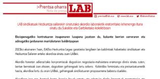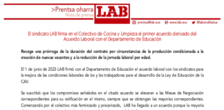 LAB sindikatuak Hezkuntza sailarekin sinatutako Akordio laboraletik eratorritako lehenengo akordioa sinatu...