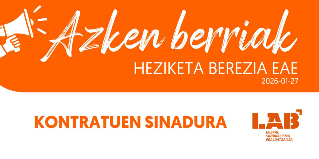 DEIALDIAKDEIALDIAK (Heziketa Berezia) Azken Berriak: Kontratuen sinadura 2026-01-27 91 FacebookTwitterPinterestWhatsApp Hezkuntza Sailak adierazi du 2026/02/02tik aurrera Ordezkagunean esleitutako Hezkuntza Bereziko plazen kontratuak digitalki sinatu beharko direla. Digitalki sinatu ahal izateko, adierazitako data baino lehen BakQ edukitzea gomendatzen da.