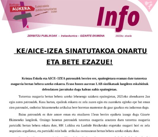 Gizarte Ekimeneko ikastetxeak: LAB, STEILAS, CCOO eta UGT sindikatuok epaitegietara joko dugu, Kristau Eskola eta AICE-IZEA patronalek greba amaierako akordioan sinatutako %16ko soldata-igoera bete...