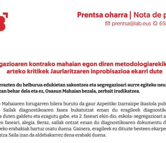 Eskola segregazioari aurre egiteko neurrien dekalogoa aurkeztu du LABek