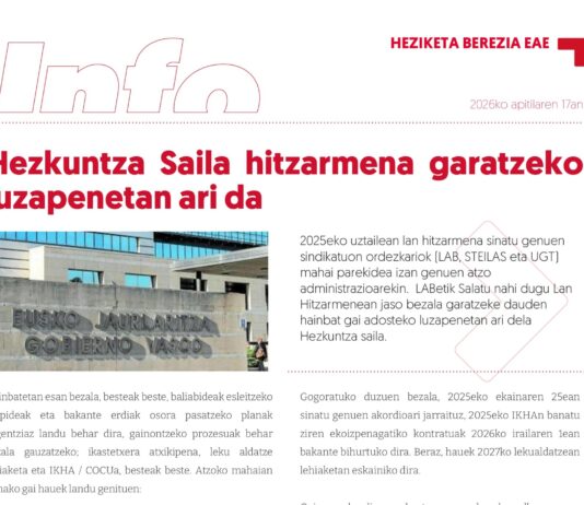 EAEko Irakasleak: Hezkuntza publikoa euskalduntzeko baliabide gehigarriak LABek erakutsitako jarrera irmoarengatik adostu eta aplikatu ditu Hezkuntza Sailak, ez bere borondatez