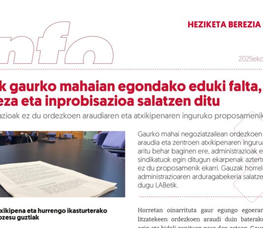 LABek hezkuntza publikoan lortutako lan hitzarmenak betetzeko eta garatzeko exijitu dio Hezkuntza Sailari