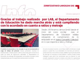 Personal de Servicios de la CAV: Gracias al trabajo realizado por LAB, el Departamento de Educación ha dado marcha atrás y está cumpliendo...