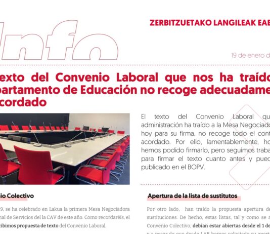 Personal de Servicios de la CAV: El texto del Convenio Laboral que nos ha traído el Departamento de Educación no recoge adecuadamente lo acordado