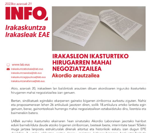 EAEko irakasleak: ikasturteko hirugarren mahai negoziatzailea