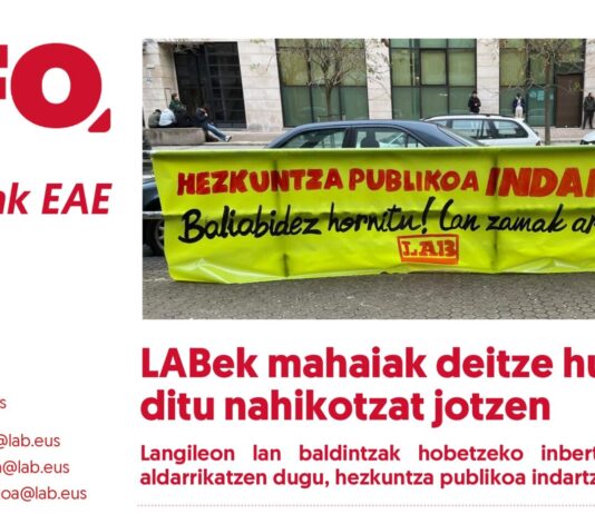 EAEko Irakasleak: LABek hezkuntza kalitatean urratsak emateko adostutako baliabide guztiak txertatzea eskatu dio Hezkuntza Sailari
