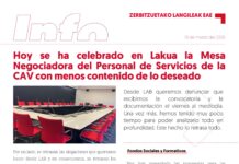 ¡La paciencia tiene límites! Ha pasado un año desde el acuerdo de fin de huelga y no quieren pactar ningún convenio. Las patronales quieren reinterpretar el acuerdo una y otra vez o renegociar lo firmado, con más recortes. Por ello, LAB se reunirá con los representantes sindicales del sindicato a nivel de la CAV para analizar la situación, analizar los instrumentos jurídicos existentes y valorar las posibilidades de acción sindical para que cumplan y respeten el acuerdo firmado. Trasladaremos las decisiones tomadas a las patronales en la mesa negociadora que tendremos el próximo mes de abril.