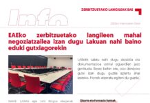 4. Medidas para el mantenimiento del empleo: Tal y como acordamos en el acuerdo de fin de huelga, teníamos que realizar 3 reuniones para analizar la situación de la matriculación y evitar la destrucción de empleo con la creación de nuevas figuras en los centros (euskaldunización, atención a la diversidad, coeducación, TIC…). Las citadas reuniones están pendientes debido al desinterés de KE y AICE-IZEA y la desidia del sindicato mayoritario. En las mesas de negociación LAB es el único sindicato que da importancia a este punto.