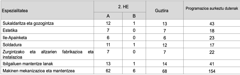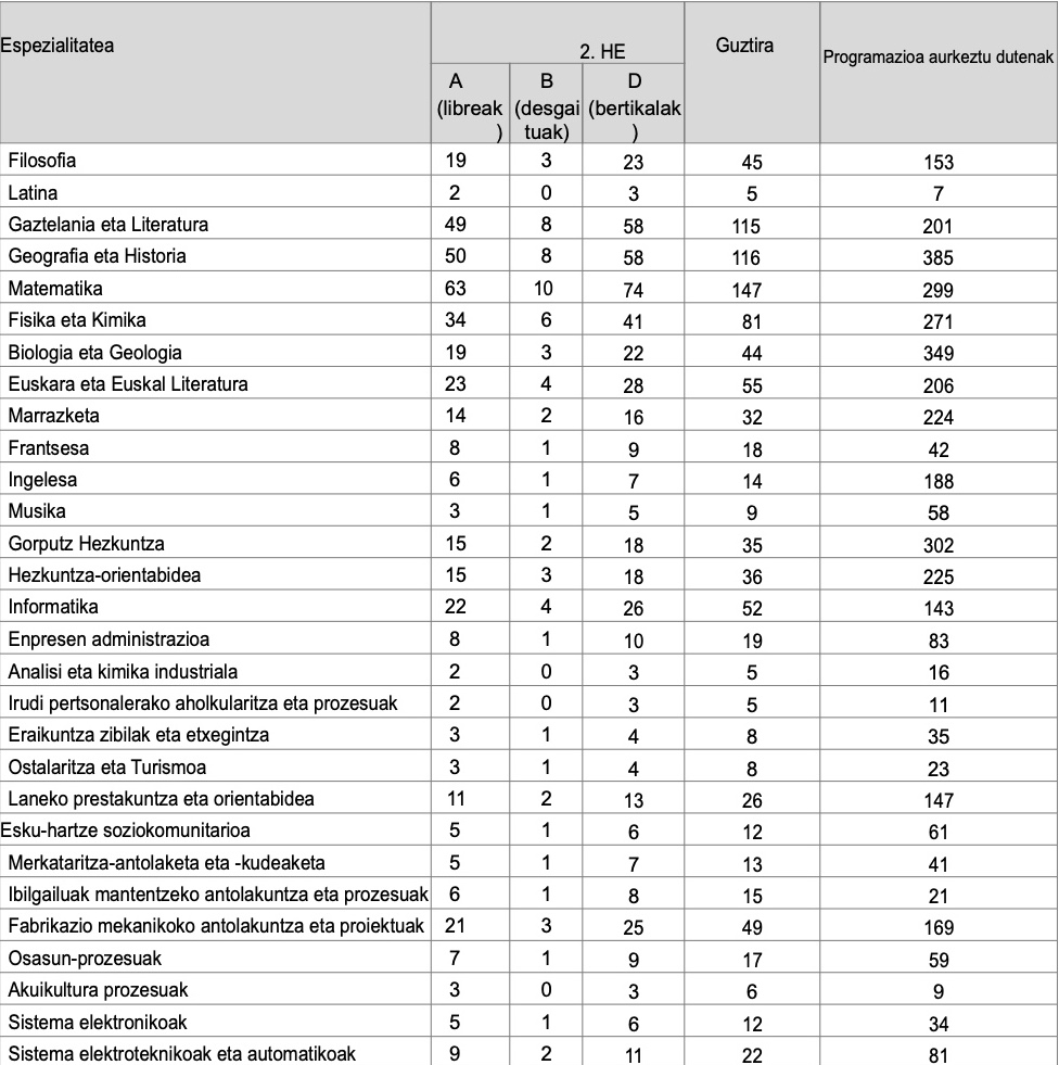 EAEko 2020ko Bigarren Hezkuntza eta Lanbide Heziketako oposaketetan, programazio didaktikoak aurkeztu ondoren, taula honetan, espezialitate bakoitzean dauden eta eskaintzen diren plaza kopurua agertzen zaizue: