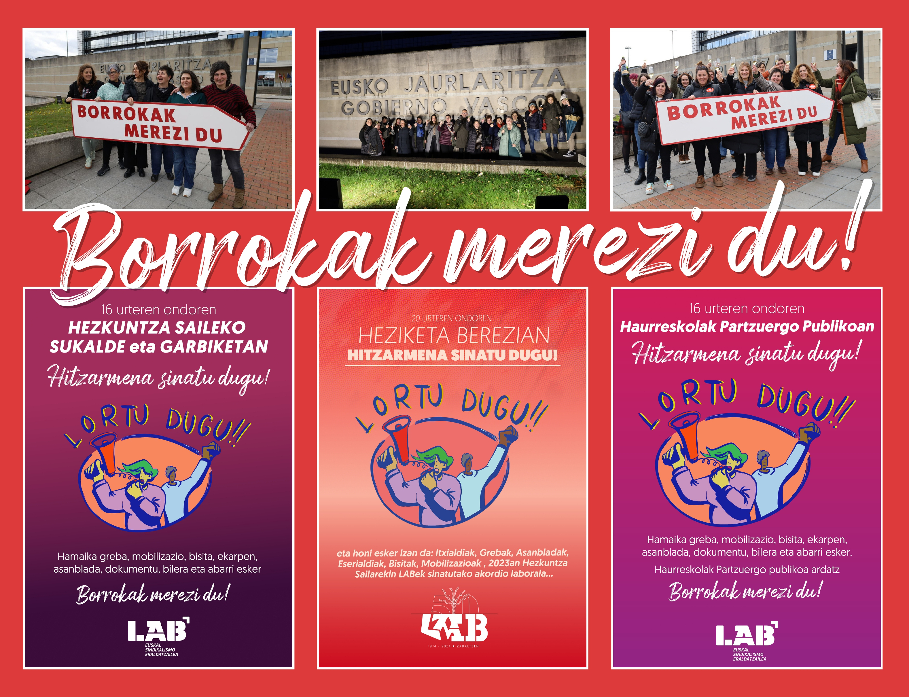 EAEko hezkuntza publikoan, LAB lehen indarra den kolektibo guztietan lan hitzarmen berriak sinatu ditugu 3 hilabetetako epean, eta hauek hobetzeko lanean dihardugu jada.