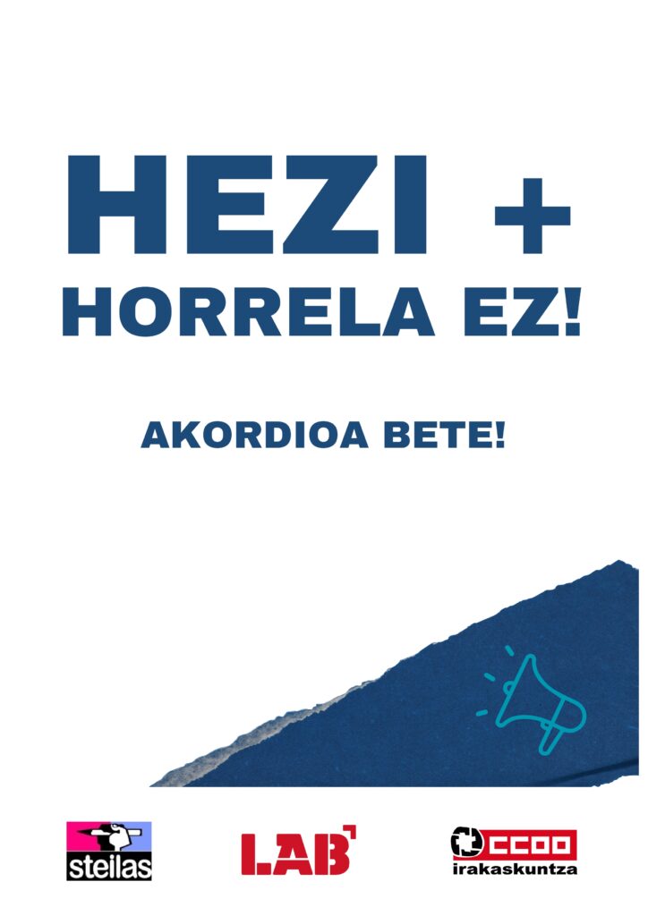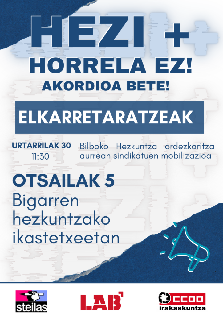 LAB, STEILAS eta CCOO sindikatuok xantaia logika eta inposizio jarrera albo batera uzteko eskatzen diogu Hezkuntza Sailari eta HEZI+ adostu baten alde egiten dugu, hezkuntza-komunitatearen parte-hartzea, lan-baldintzen errespetua dituen eta Hezkuntza Publikorako baliabide nahikoak oinarri izango dituena.