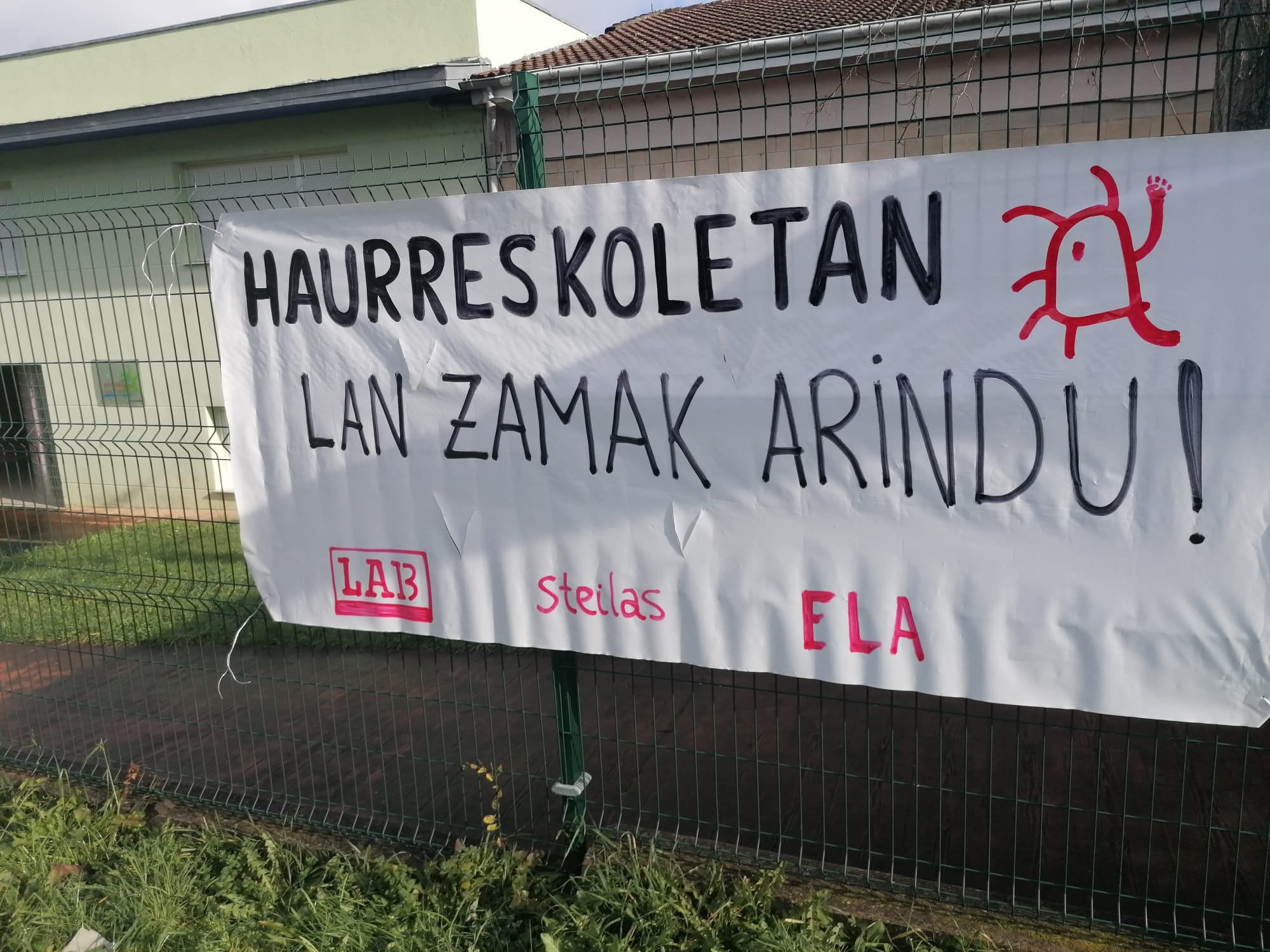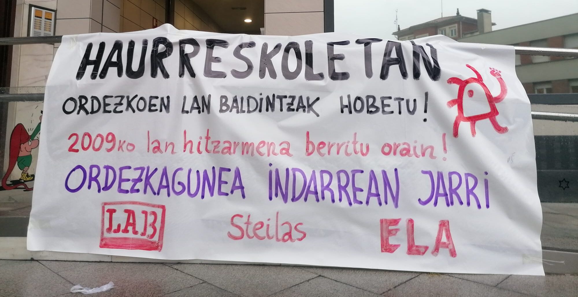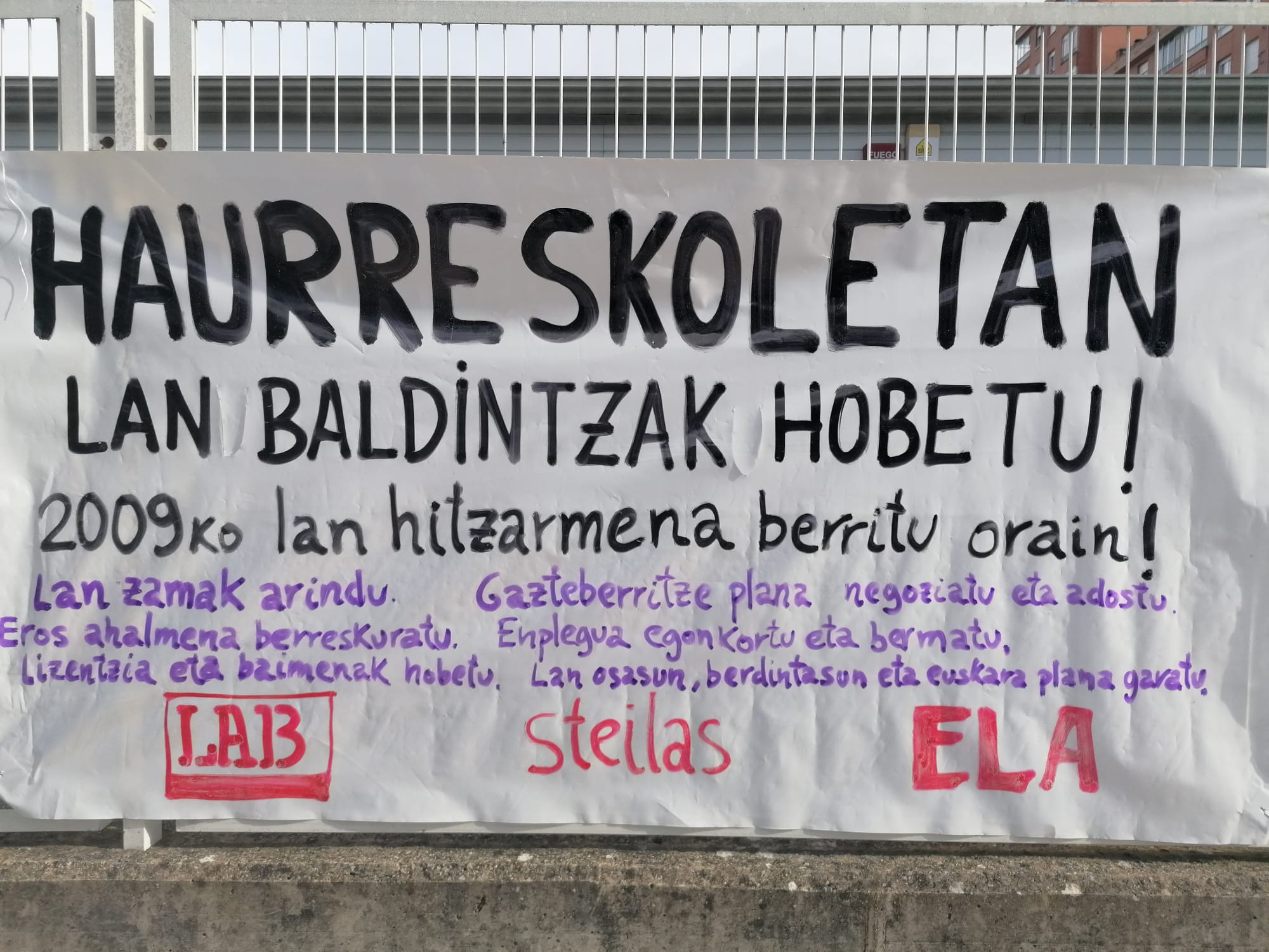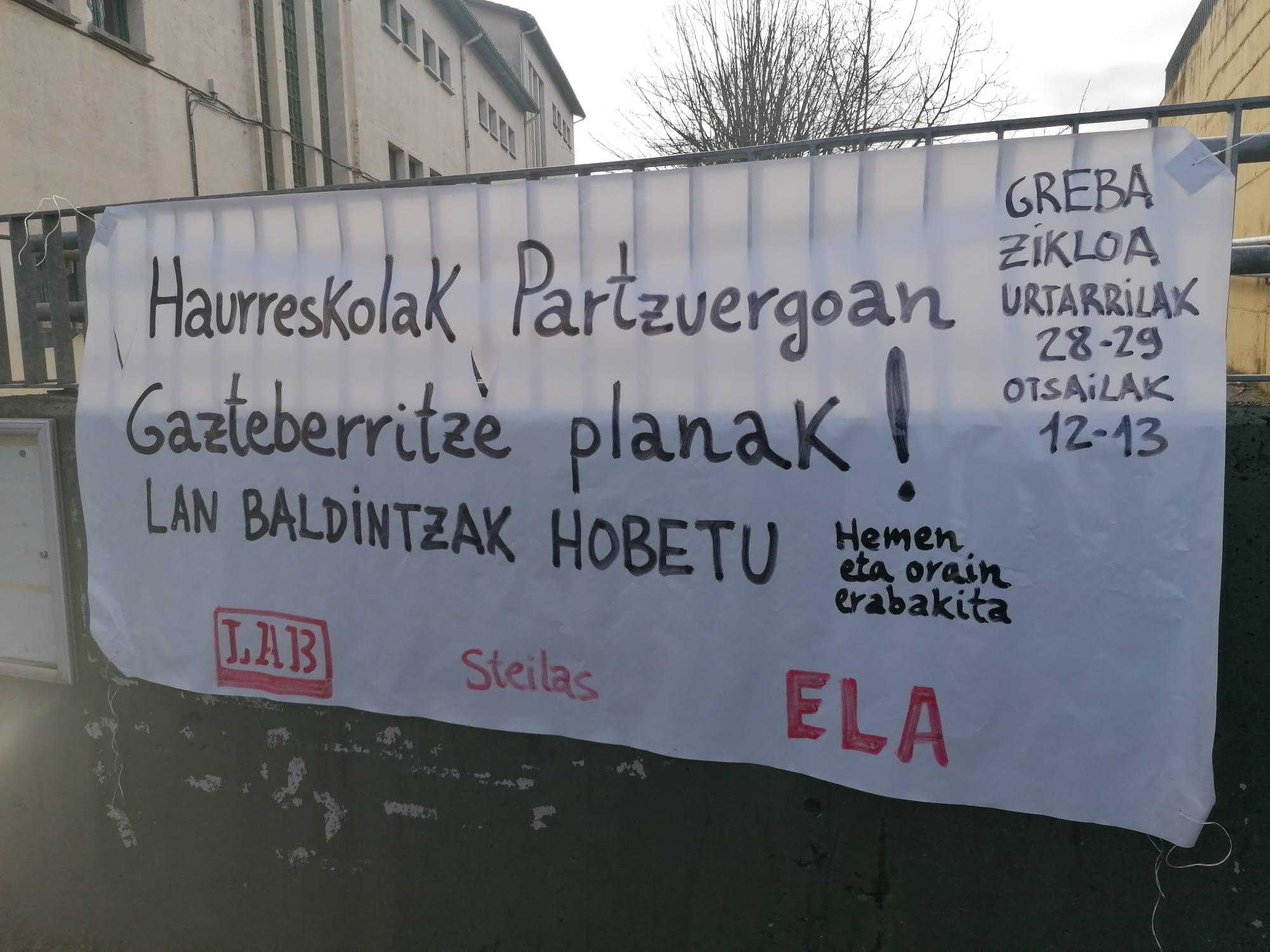 LAB, STEILAS eta ELA sindikatuok aurkeztutako mobilizazio eta greba dinamikarekin batera, urtarrilaren 17tik aurrera haurreskolen kanpoaldea borrokan gaudela irudikatzera animatzen zaituztegu (amantalak eskegi, kartelak zein pankartak jarri…).