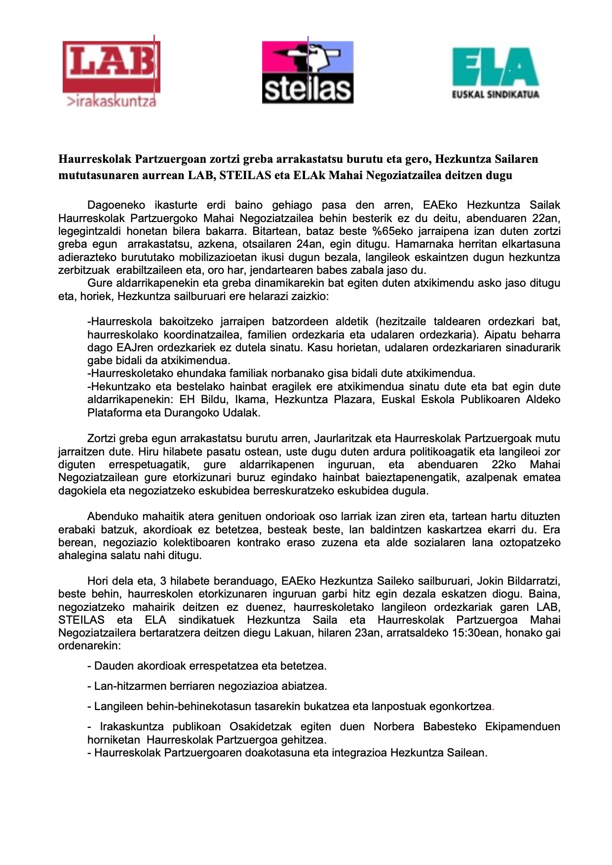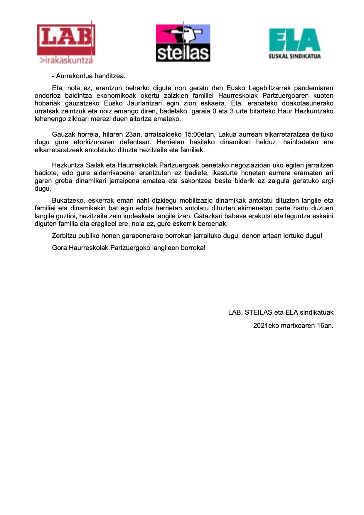 Hori dela eta, 3 hilabete beranduago, EAEko Hezkuntza Saileko sailburuari, Jokin Bildarratzi, beste behin, haurreskolen etorkizunaren inguruan garbi hitz egin dezala eskatzen diogu. Baina, negoziatzeko mahairik deitzen ez duenez, haurreskoletako langileon ordezkariak garen LAB, STEILAS eta ELA sindikatuek Hezkuntza Saila eta Haurreskolak Partzuergoa Mahai Negoziatzailera bertaratzera deitzen diegu Lakuan, hilaren 23an, arratsaldeko 15:30ean, honako gai ordenarekin: