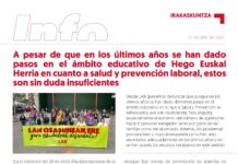 Gauza berdina gertatzen da Heziketa Berezian, haur eskola zein Haur Hezkuntzako irakasleekin, Sukaldari eta Garbitzaileekin arazo muskuloeskeletikoekin. Bitartean, erakunde eta patronalak absentismoaz hitz egiten jarraitzen dute. Langileon osasuna kolokan jartzen duen sistema baten aurrean gaude.