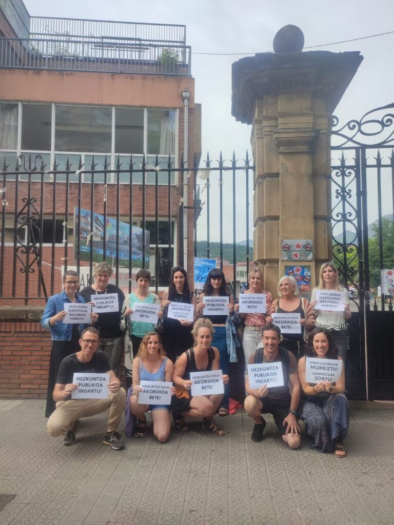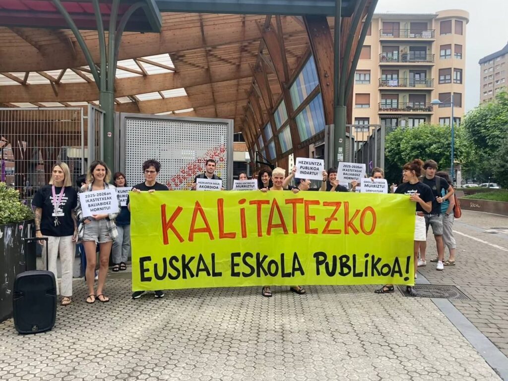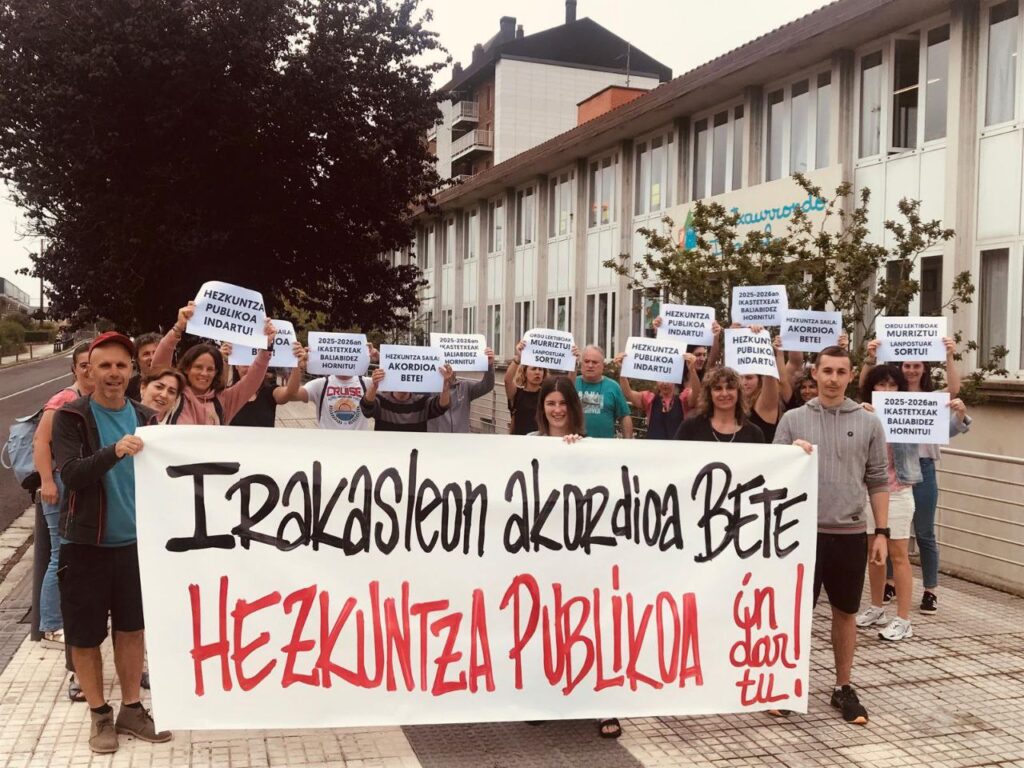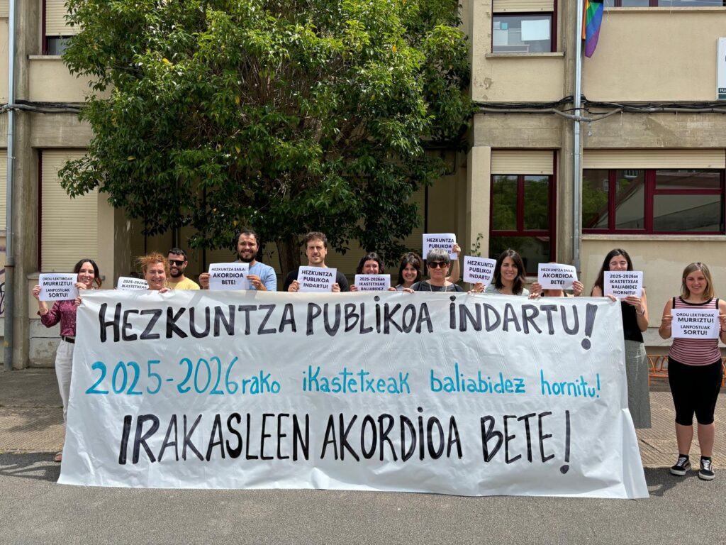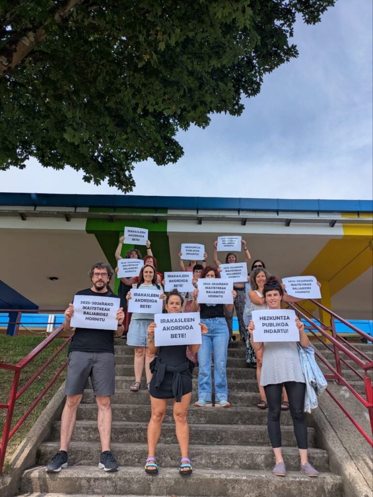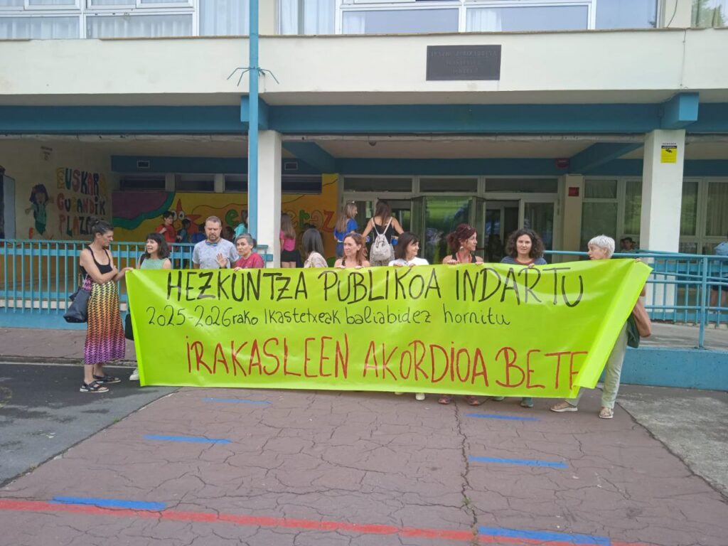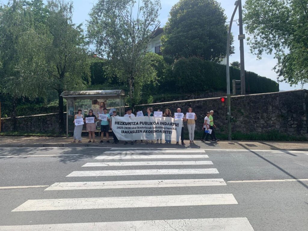 LABek deituta, Araba, Bizkaia eta Gipuzkoako hezkuntza publikoko irakasleek lanuzteak eta mobilizazioak egin dituzte, Hezkuntza Sailari marketing kanpaina alboratu, sinatutako akordioa bere osotasunean bete eta 2025-26 ikasturtean ikastetxeak hornitu ditzan exijitzeko.