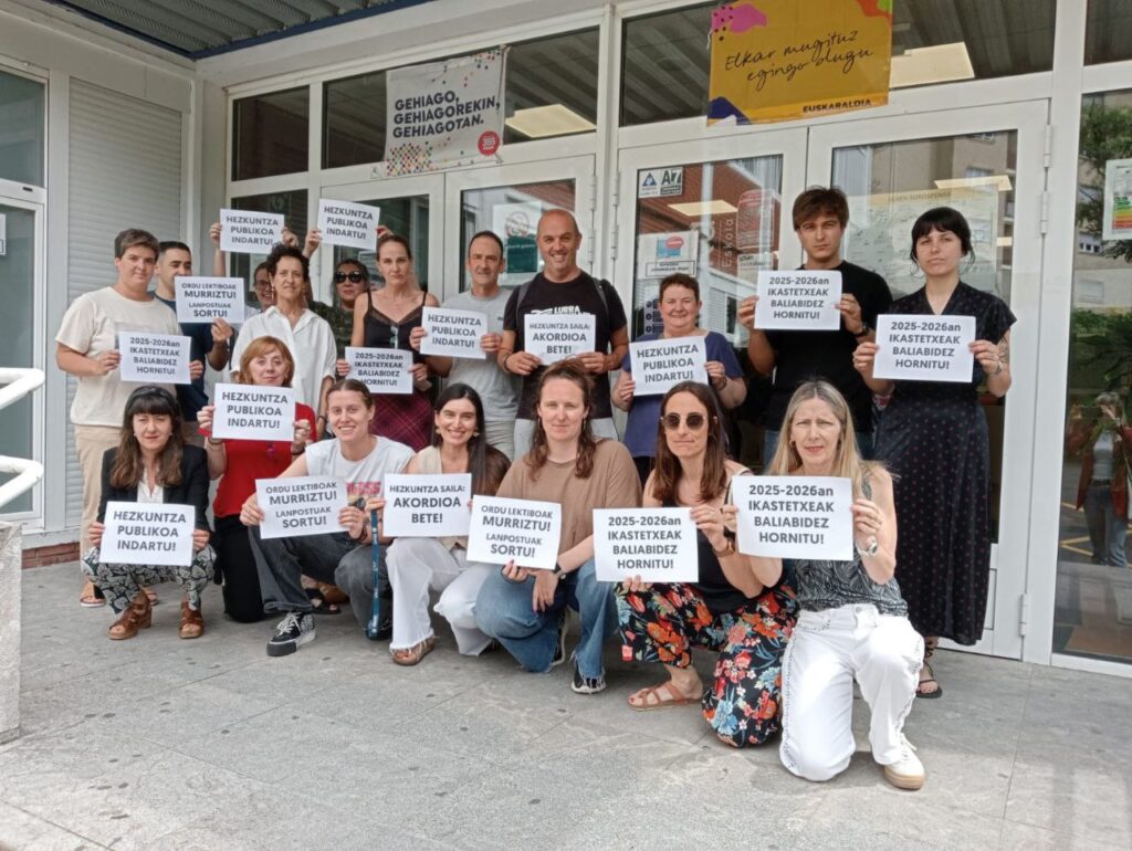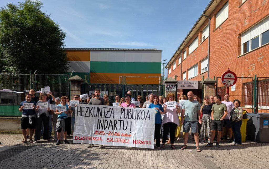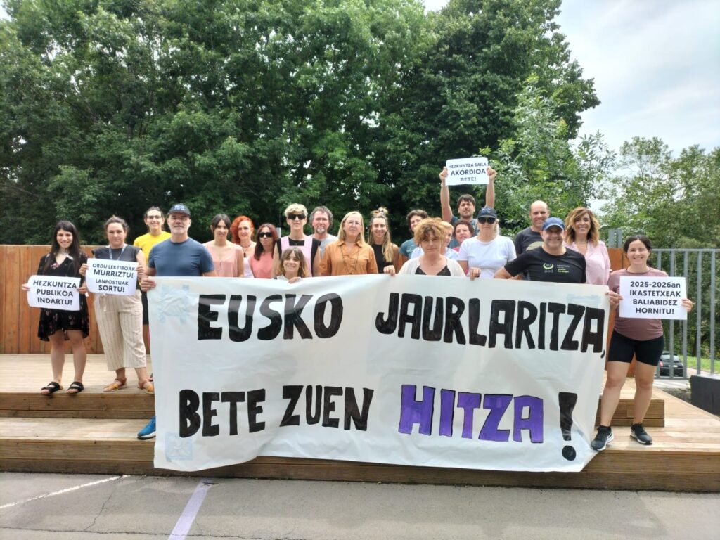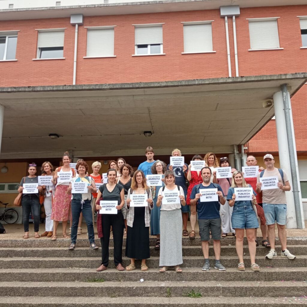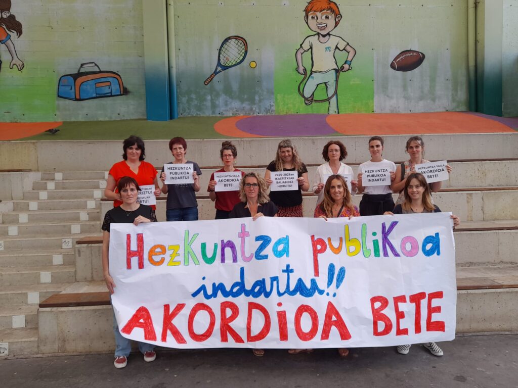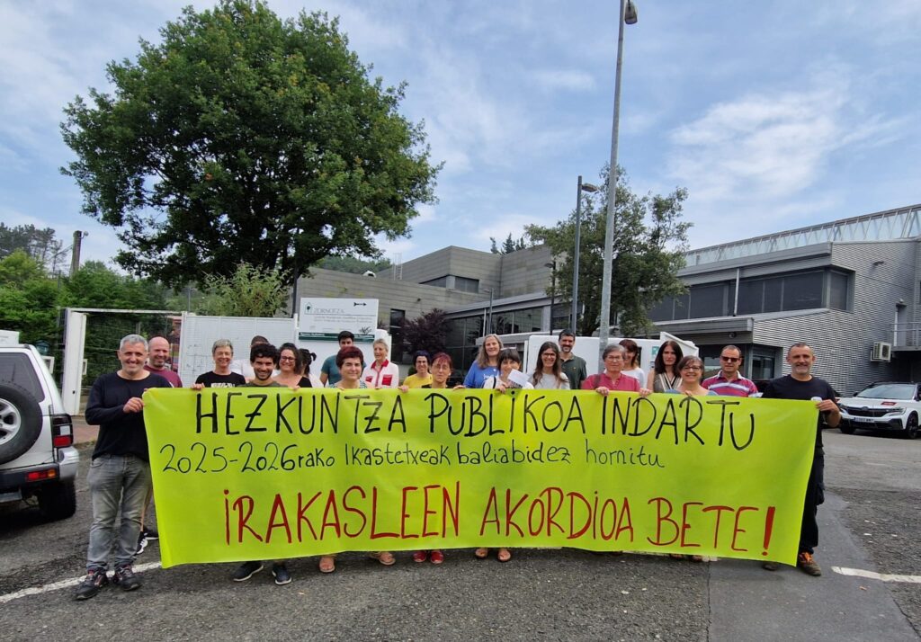 LABek deituta, Araba, Bizkaia eta Gipuzkoako hezkuntza publikoko irakasleek lanuzteak eta mobilizazioak egin dituzte, Hezkuntza Sailari marketing kanpaina alboratu, sinatutako akordioa bere osotasunean bete eta 2025-26 ikasturtean ikastetxeak hornitu ditzan exijitzeko.