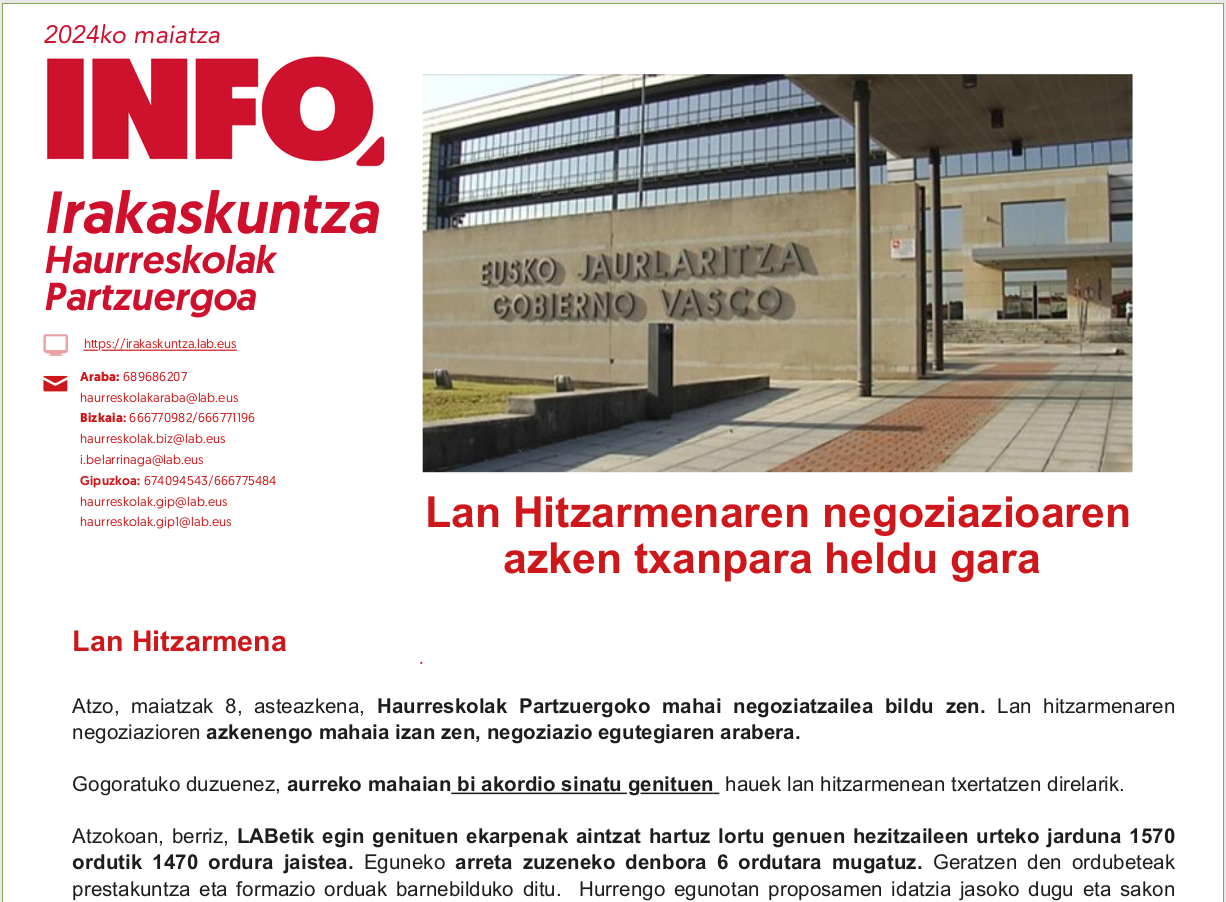 LABek 2023ko ekainean Hezkuntza Sailarekin sinatutako Akordio Laboralak negoziaziorako bideak ireki eta hainbat gairen inguruan adostasunetara iristea ahalbideratu digu. Orain lan hitzarmenaren azken dokumentuaren zain gaude eta maiatzaren 17ra arte erantzuna emateko epea eman digute.