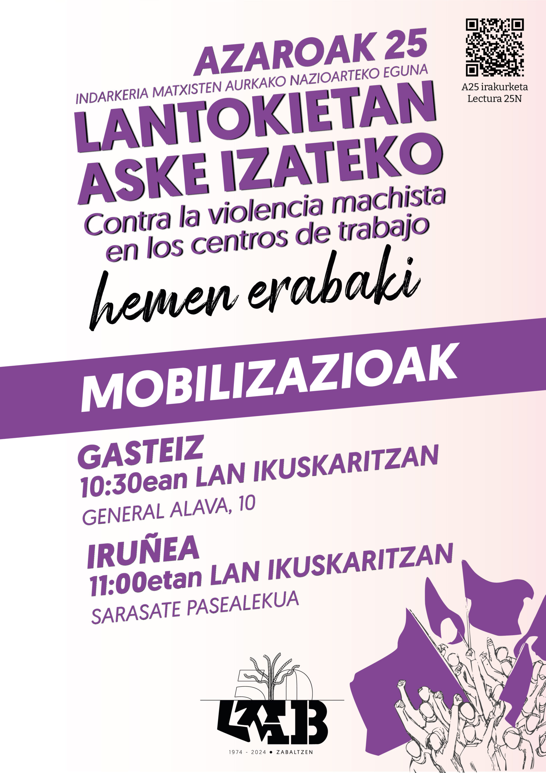 Instituzioei, eta, zehazki, lan ikuskaritzari, LABek eskatzen dio indarkeria matxistari aurre egiteko politika eraginkorrak garatzea. Jarrera, sinesmen eta indarkeria matxista guztiei aurre egin nahi diegula esaten dugu lantokietan aske izan nahi dugula aldarrikatzen dugunean, eta azpimarratu nahi dugu borroka honetan jarraituko dugula sindikalismotik fronte guztietan. Ildo horretan, azaroaren 25ean mobilizazioak egingo ditu LABek Gasteizen (10:30) eta Iruñean (11:00), EAEko eta Nafarroako lan ikuskaritzen aurrean, hurrenez hurren.