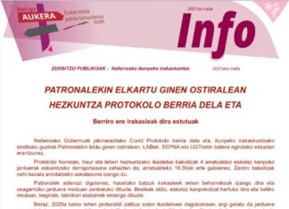 Nafarroako Gobernuak jakinarazitako Covid Protokolo berria dela eta, Itunpeko irakaskuntzako sindikatu guztiok Patronalekin bildu ginen ostiralean, LABek, SEPNA eta UGTrekin batera egindako eskariari erantzunez. Protokolo horretan, Haur eta Lehen Hezkuntzako ikastetxe bakoitzak 4 arratsaldez eskolaz...