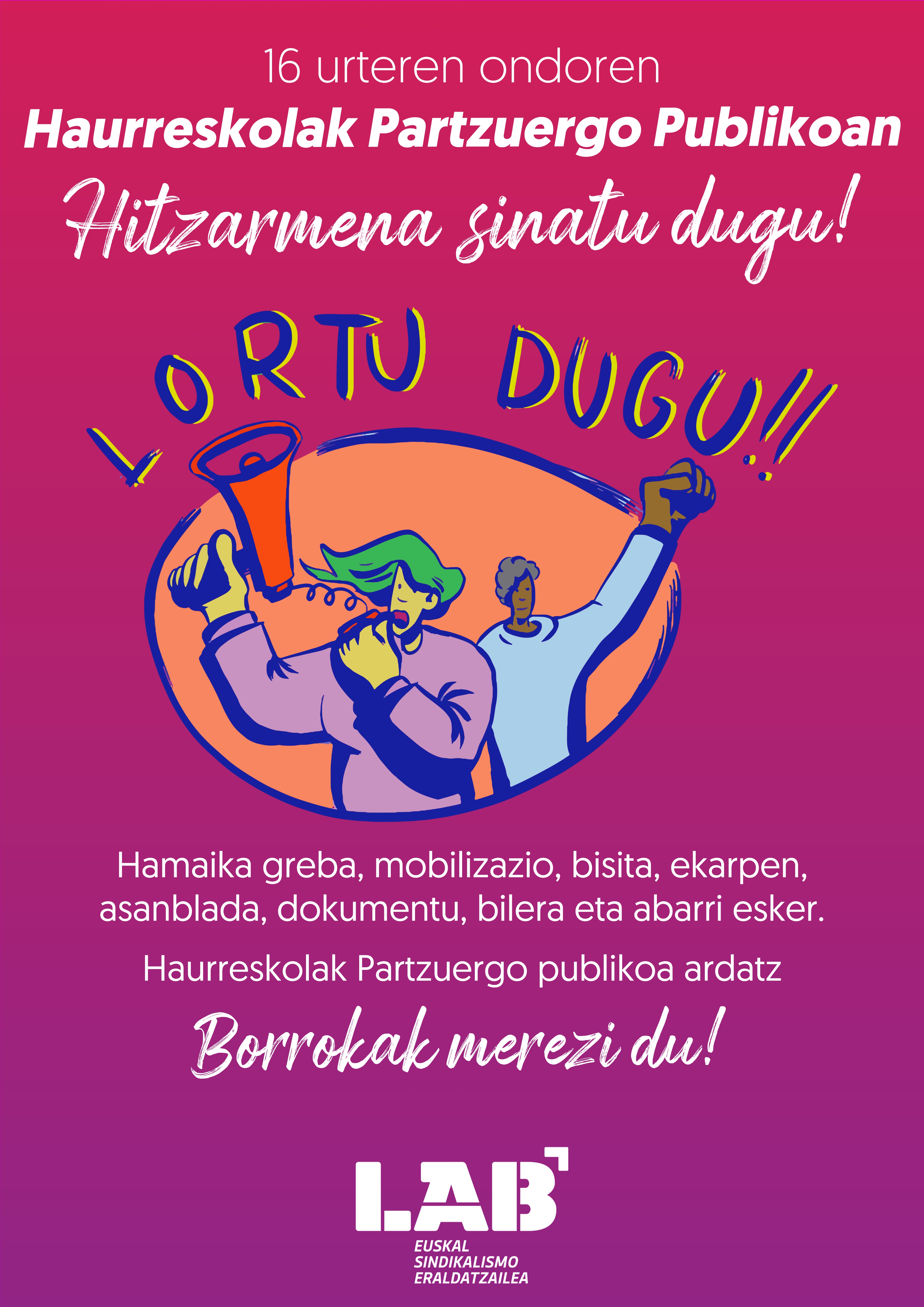 Beste behin borrokak merezi duela baieztatu dugu. Azken urteetan hamaika greba eta mobilizazio burutu ostean, azken biak pasa den urtarrilean eta hezkuntza publikoko greba ziklo honen otsaileko bi greba egunen atarian, Eusko Jaurlaritza posturaz aldatzera behartu dugu.