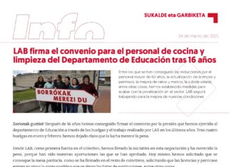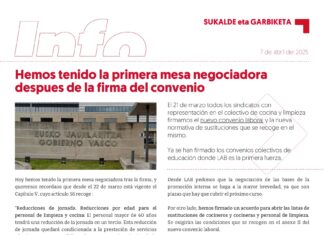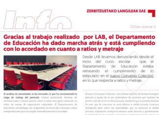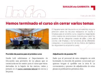 Ayer, día 11, se celebró en Lakua la Mesa Negociadora del personal de servicios del Departamento de Educación de la CAV. Desde LAB exigimos con firmeza que el Departamento abandone las excusas y los...